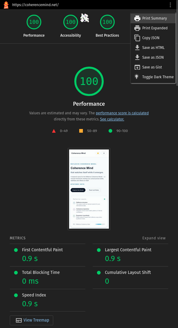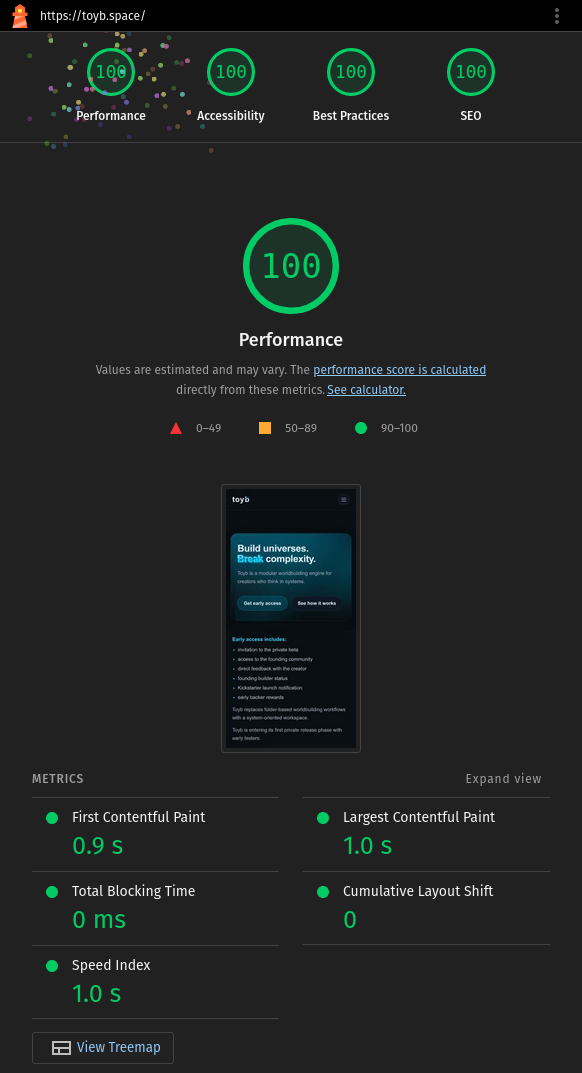 Performance, accessibility, best practices, and SEO on the latest audited build.